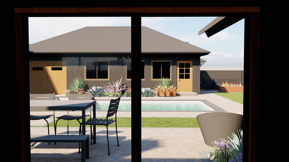 The backyard features a clean-lined pool, outdoor dining space, and a cozy lounge anchored by a 4’ corten steel fire pit. Corten edging, consistent paving materials, and dense evergreen screening create privacy and polish. The converted garage ADU and layered design details boost both lifestyle appeal and long-term value, making it attractive to homebuyers.